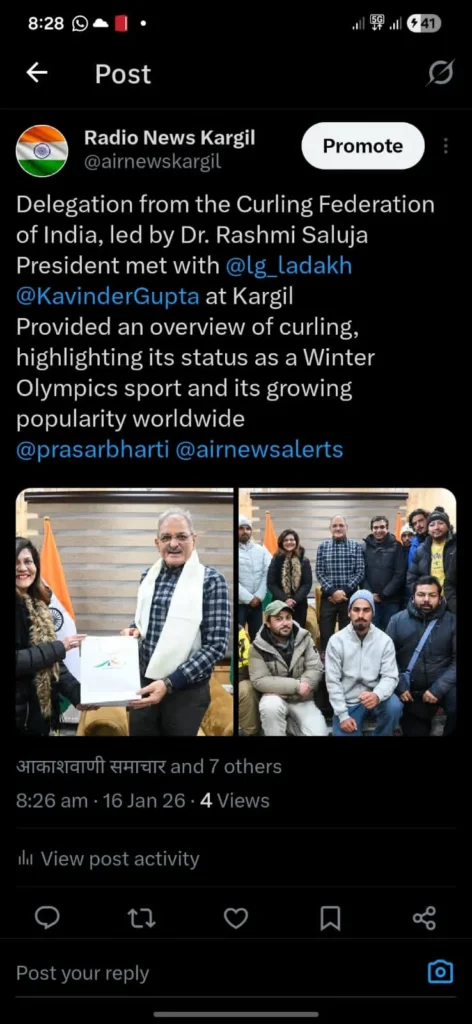 Kargil, January 15:A high-level delegation of the Curling Federation of India (CFI), led by Dr. Rashmi Saluja, President of CFI, called on the Hon’ble Lieutenant Governor of Ladakh, Kavinder Gupta, in Kargil to discuss the promotion and development of curling in the region. The meeting was attended by Nitin Yadav, SSP Kargil; Imteeaz Kacho, Additional […]
